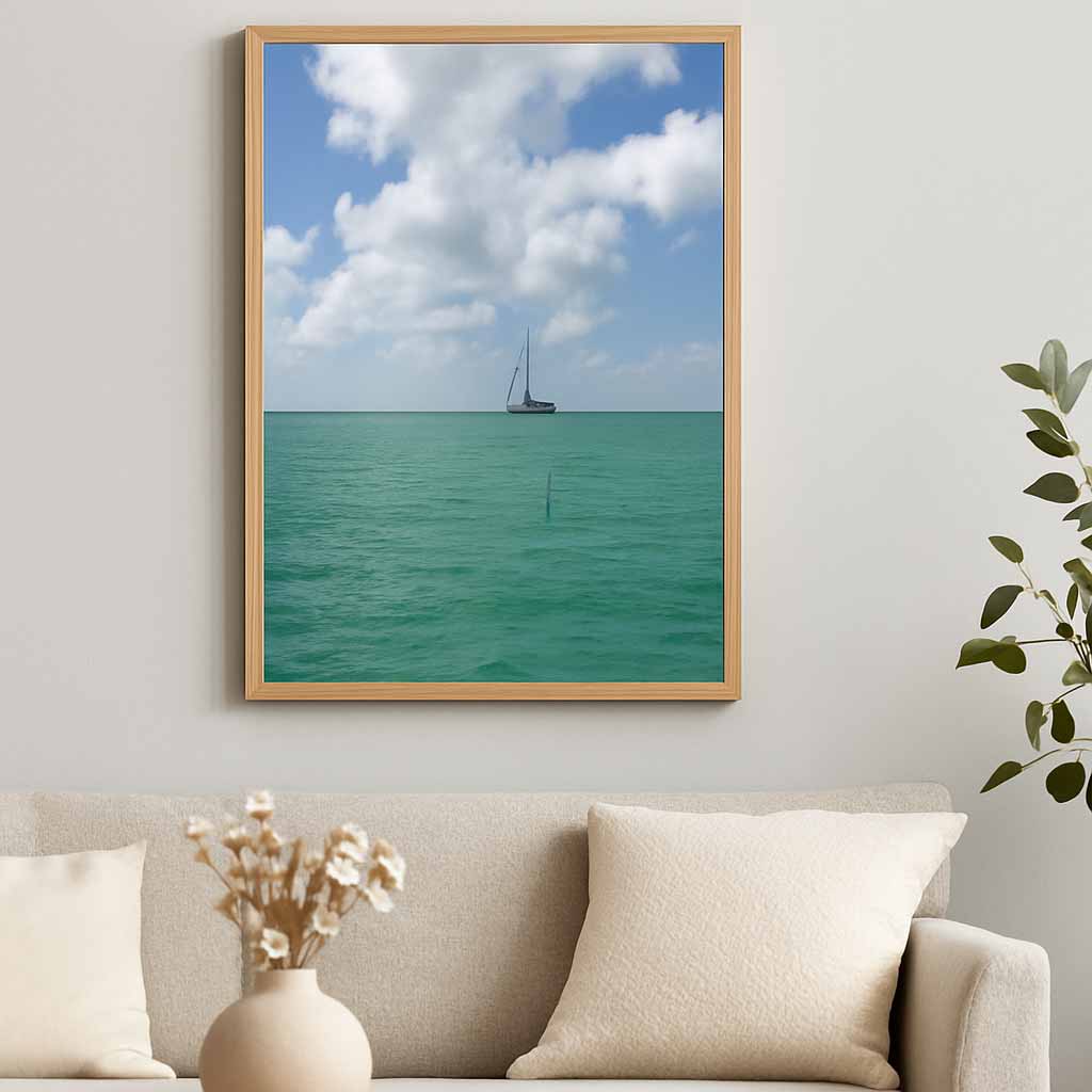 No coração do oceano, um veleiro solitário flutua sob o céu pontilhado de nuvens,